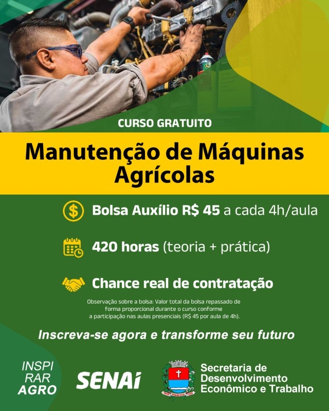 A Prefeitura de Penápolis, em parceria com o Senai e a empresa John Deere, está com inscrições abertas para o Programa Inspirar Agro, com o curso de qualificação gratuito de Manutenção de Máquinas Agrícolas. As inscrições são feitas diretamente no site https://inspiraragro.com.br/estudante/10.